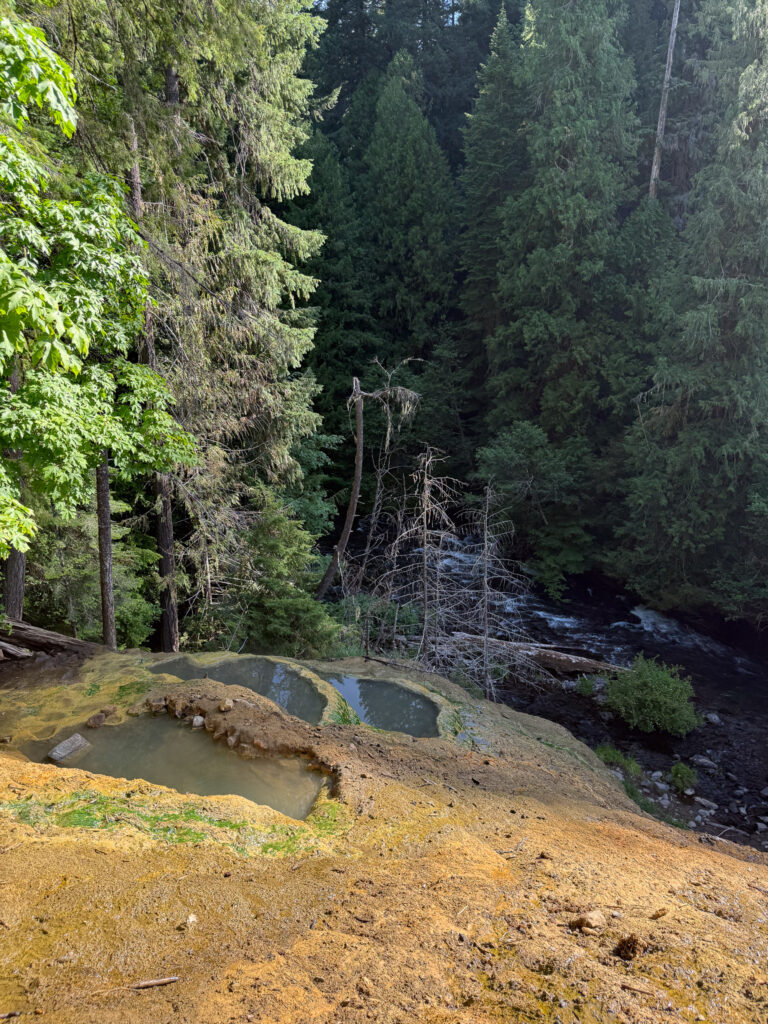 After you park at the trail head, you will start your hike by crossing a bridge, where the trail starts to go uphill. The hike is .6 round trip, but is steep and slippery. When you get there, you will find tiered hot spring pools built into a cliff side overlooking the North Umpqua River. The pool temps vary from 110-115 degrees. Clothing is optional, and parking is $5 for a day pass.