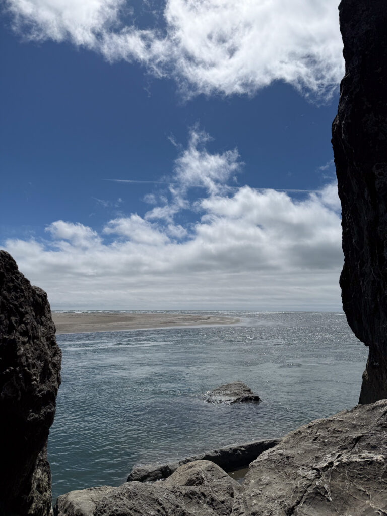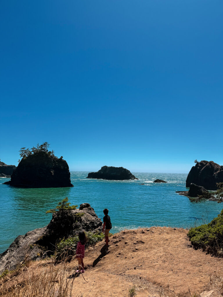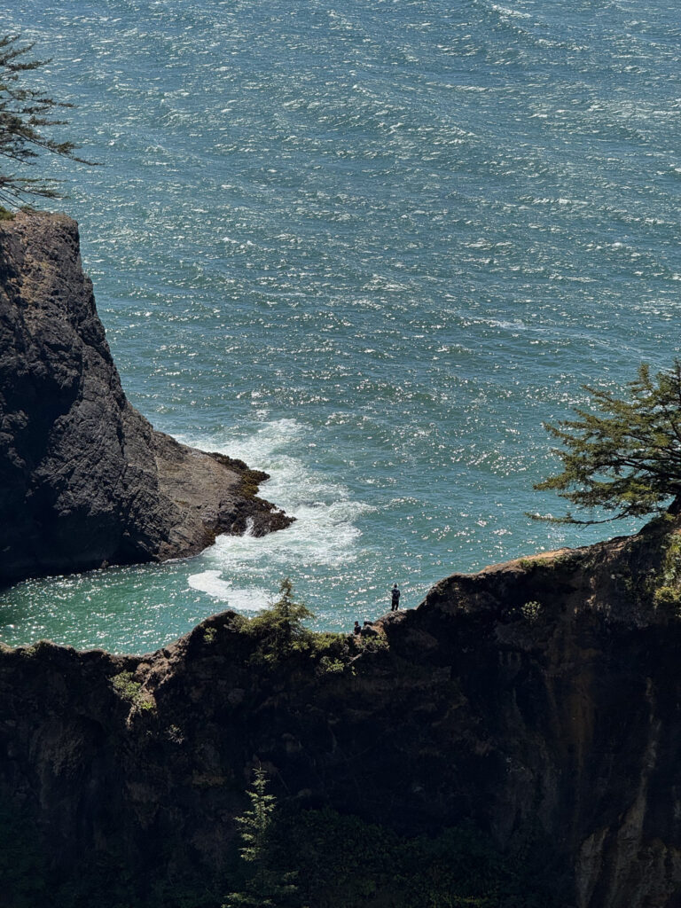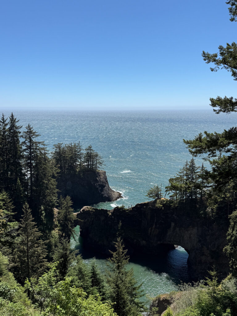 One of the best things you can do on a coastal Oregon road trip is to drive the 12 mile Samuel H. Boardman Corridor, home to some of the most dramatic views of the Oregon coast. There is a dedicated gravel parking area right off Highway 101. Be prepared to see gorgeous stone arches rise out of the waves, rugged coastline and a scenic forest hike. I also want to say, absolutely do not hike on the natural bridge itself. Multiple people have passed away from this, and no picture or video is worth your life.
