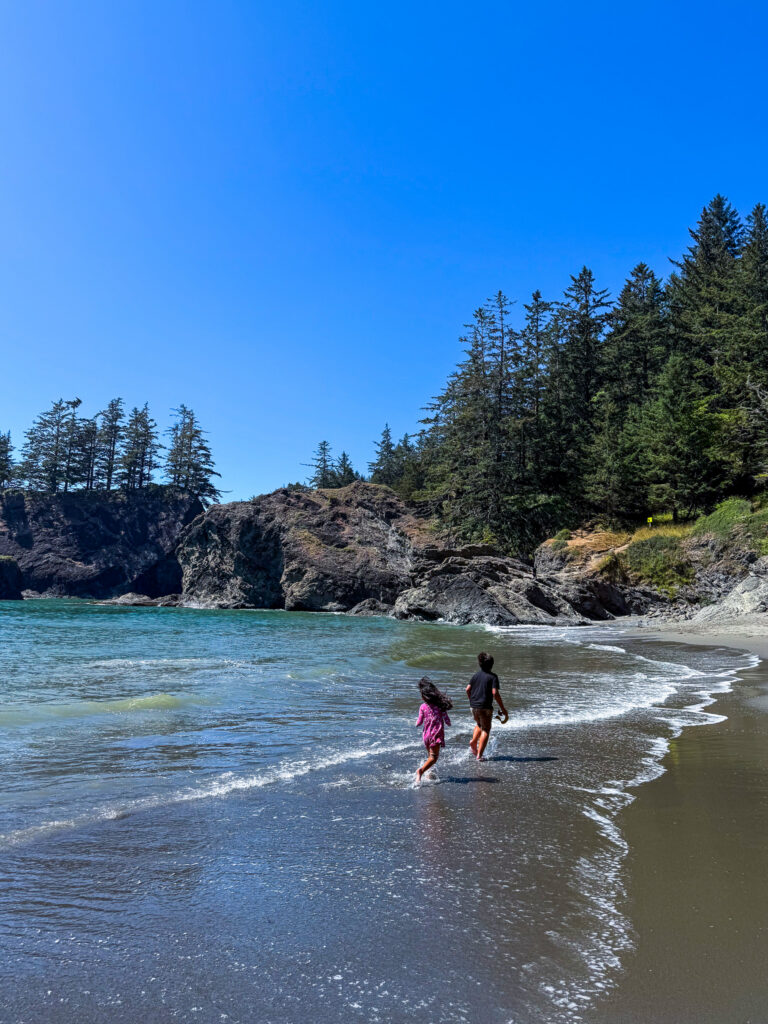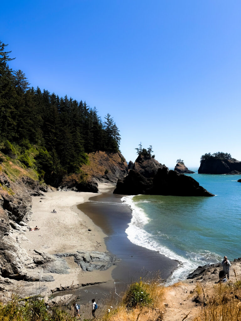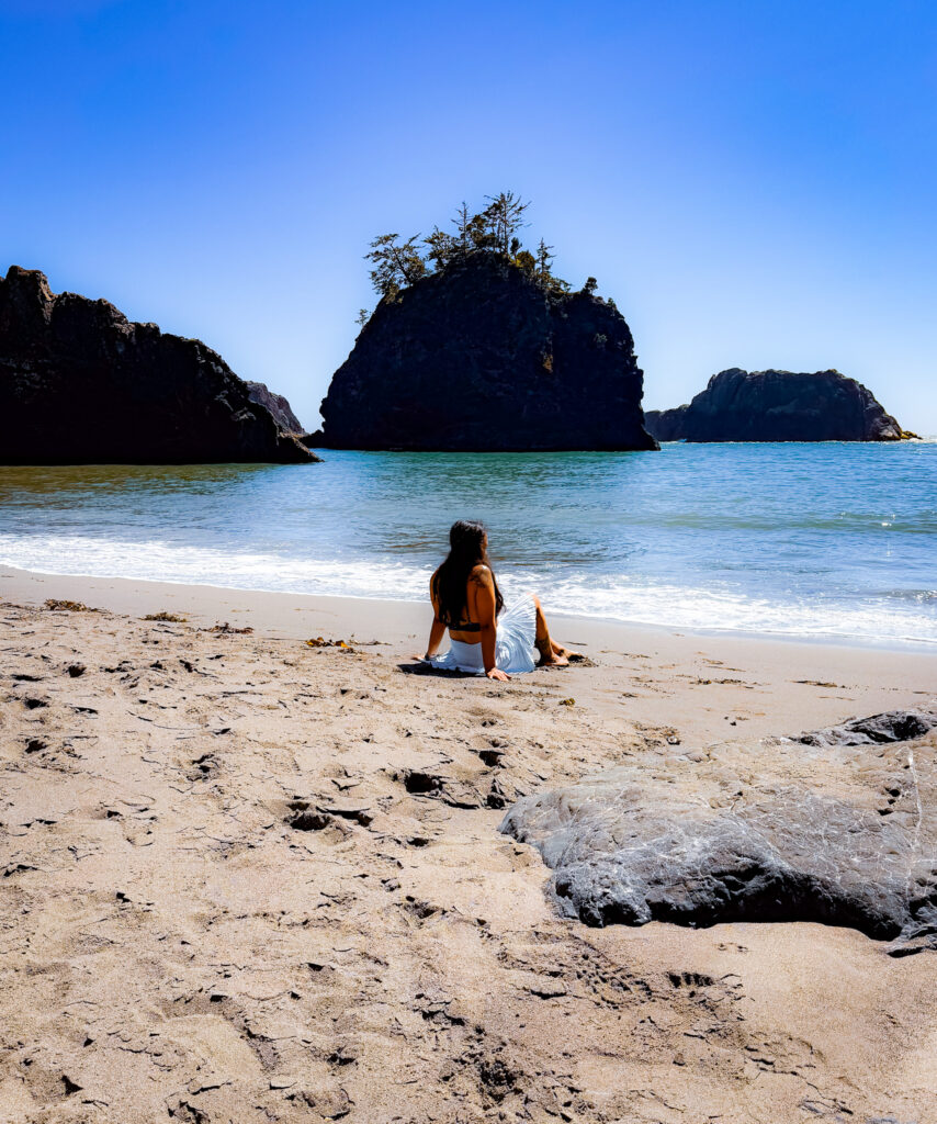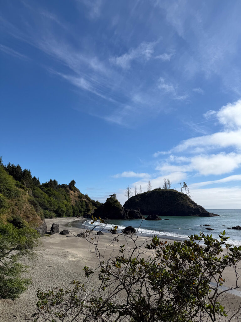 Along the Samuel H. Boardman Corridor is my favorite beach from this road trip called Secret Beach-and it lives up to it’s name too! Located north of Miner’s Creek and 11.7 miles north of Brookings on Highway 101 is an unmarked turnout. Park there, and access a steep unmarked trail that leads to a rock overlooking the beach. Low tide is essential to fully enjoy this cove. There is a sea cave you can explore, as well as a waterfall on the beach. The climb down onto the beach is a bit of a scramble, but doable. You have to work for this one, but it’s completely worth it!